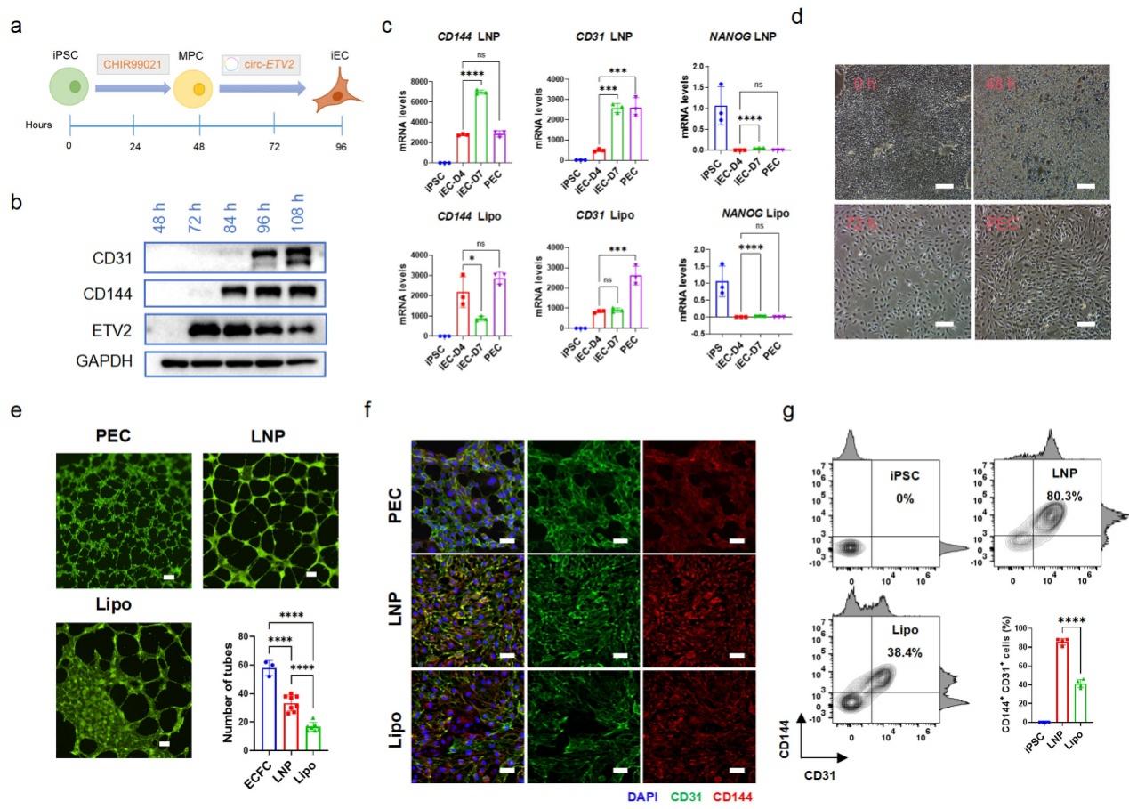 在獲得LNP4配方的基礎(chǔ)上,研究團(tuán)隊(duì)利用LNP4遞送編碼關(guān)鍵轉(zhuǎn)錄因子的circRNA,成功實(shí)現(xiàn)內(nèi)皮細(xì)胞的正向編程。通過遞送circ-ETV2,在7天內(nèi)獲得80.3%的CD31+/CD144+雙陽性內(nèi)皮細(xì)胞,且具備成管功能(圖4)。