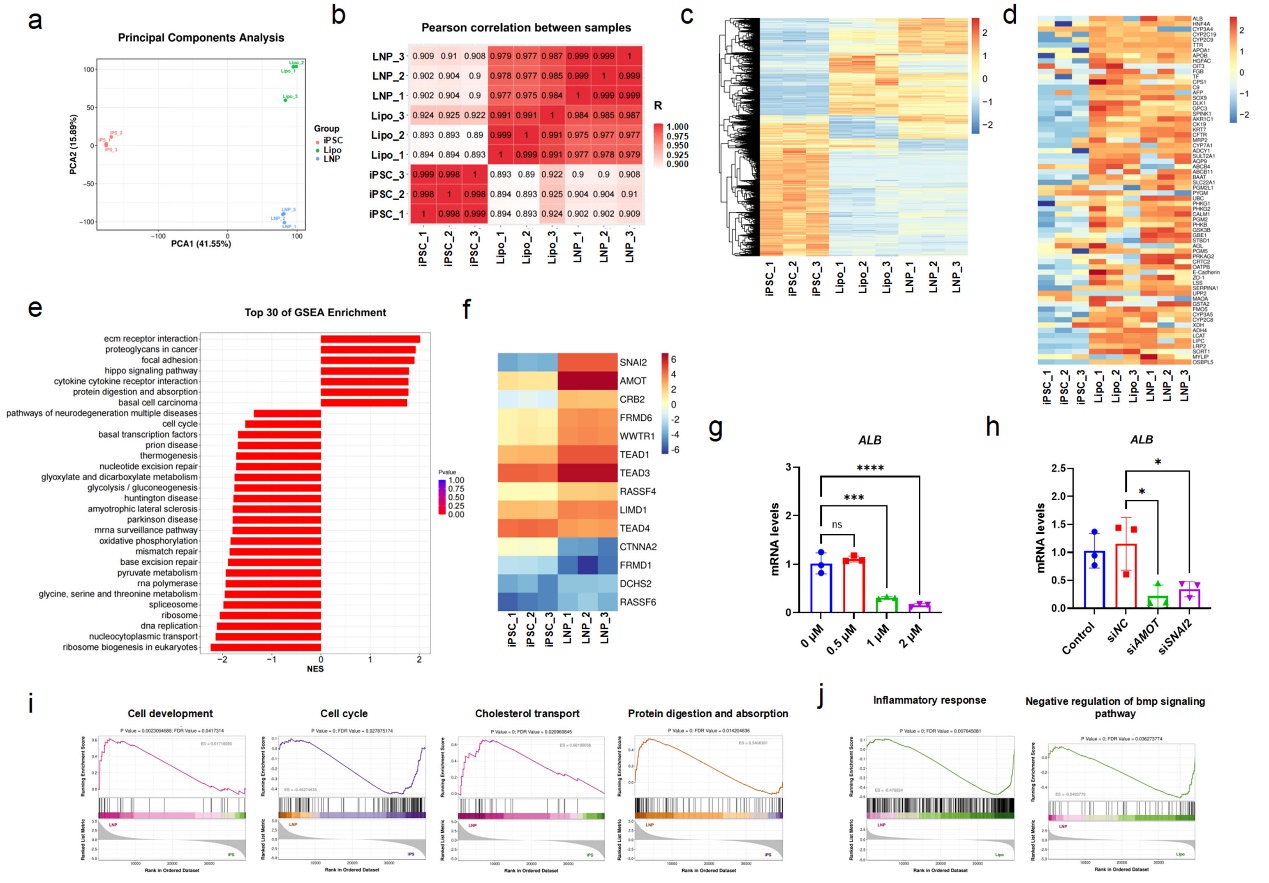 進(jìn)一步的轉(zhuǎn)錄組分析發(fā)現(xiàn),circRNA-LNP系統(tǒng)通過激活AMOT–Hippo–SNAI2信號軸,促進(jìn)肝系定向分化。抑制該通路則顯著降低肝細(xì)胞標(biāo)志物表達(dá),揭示了其在細(xì)胞命運(yùn)決定中的關(guān)鍵作用。
