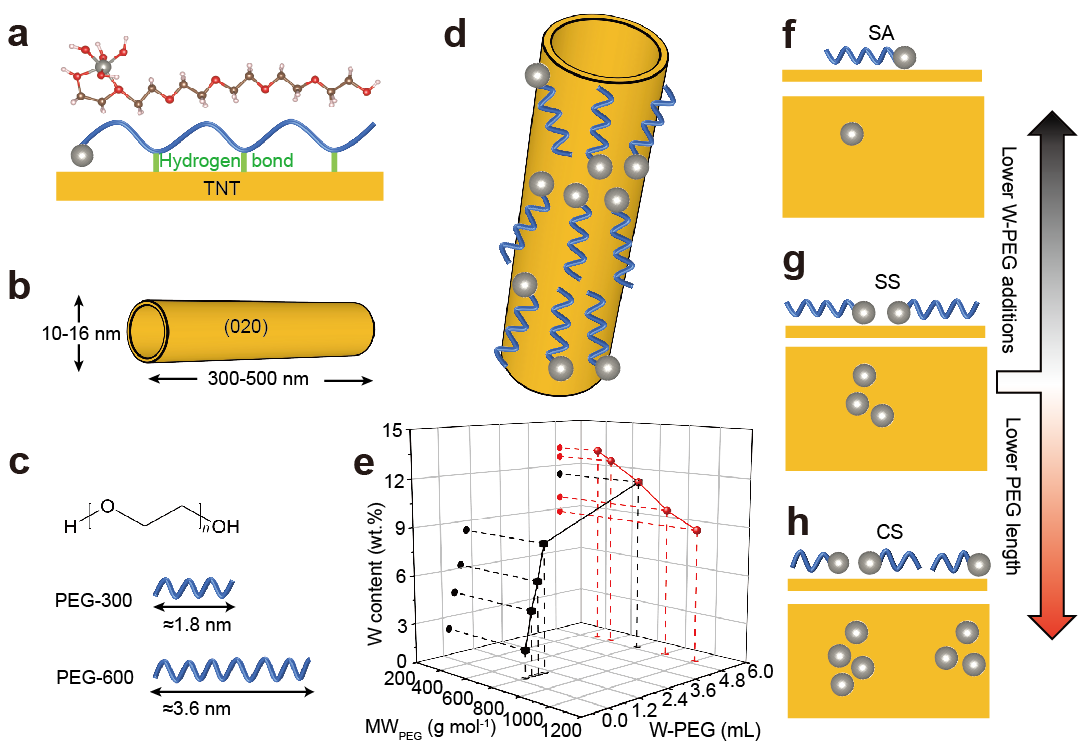 圖1.?合成 W-TNT 復合材料。(a)?W-PEG 的結(jié)構(gòu)圖及其通過氫鍵吸附在 TNT 表面的情況。圖中棕色(C)代表碳,紅色(O)代表氧,淡粉色(H)代表氫,灰色(W)代表鎢。(b)?TNT 的模型。(c) 不同分子量的PEG的相對長度。(d) W-PEG在TNT表面的吸附模型。(e) 兩個系列的W-TNT 樣品的W含量。 (f-h)?以單位點為參考,通過兩種不同的負載調(diào)節(jié)策略獲得孤立單原子和關(guān)聯(lián)單位點。