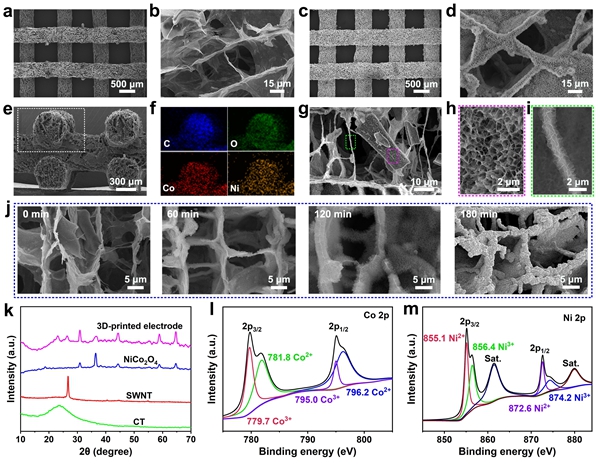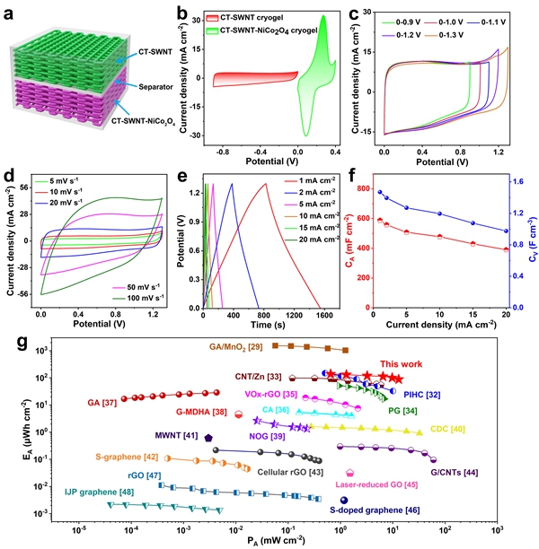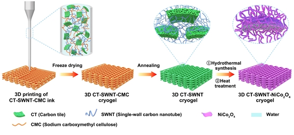 近日,中國(guó)科學(xué)院蘇州納米技術(shù)與納米仿生研究所李清文研究員、張永毅研究員,河南理工大學(xué)楊政鵬教授提出以木棉衍生的薄壁、高微孔率、高比面積、豐富雜原子摻雜、適當(dāng)彎曲的準(zhǔn)二維碳瓦片(CT)作為獨(dú)特的骨架支撐,通過墨水3D打印策略制備出了一種新型CT-單壁碳納米管(SWNT)-NiCo2O4贗電容電極。3D打印的電極結(jié)構(gòu)中,CTs和SWNTs耦合形成了大量相互連接的多級(jí)孔和連續(xù)導(dǎo)電網(wǎng)絡(luò),實(shí)現(xiàn)了活性材料NiCo2O4的均勻和高質(zhì)量負(fù)載,同時(shí)確保了暢通無阻的離子擴(kuò)散通道和充足的電子傳輸路徑。得益于電極結(jié)構(gòu)的獨(dú)特特點(diǎn),組裝的非對(duì)稱超級(jí)電容器具有高比電容和能量密度以及突出的長(zhǎng)期循環(huán)穩(wěn)定性。值得注意的是,即使在電極厚度較高時(shí),器件仍然能表現(xiàn)出優(yōu)異的電化學(xué)儲(chǔ)能性能。這項(xiàng)工作為構(gòu)建具有高容量和高功率密度的贗電容電極結(jié)構(gòu)提供了新策略。