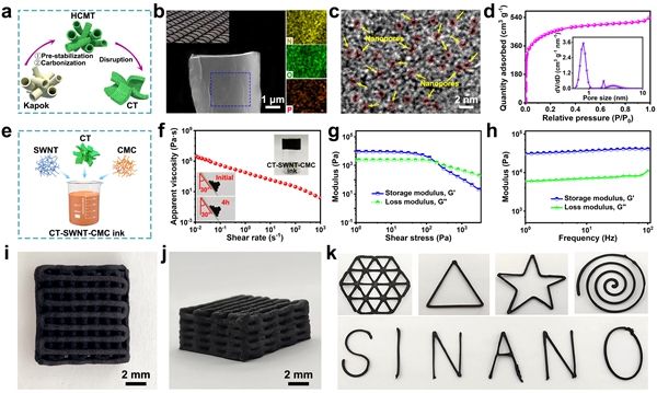 圖2. CT-SWNT-CMC墨水的制備流程、流變特性和可打印性