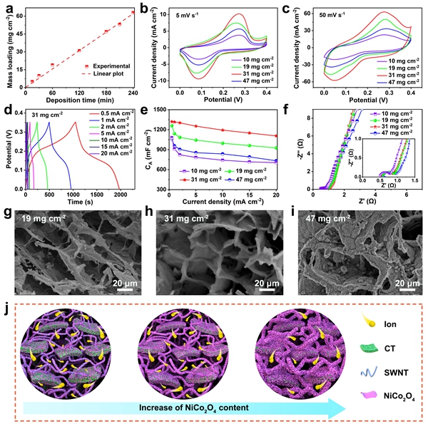 圖4. 不同NiCo2O4載量的電極電化學(xué)和形貌表征