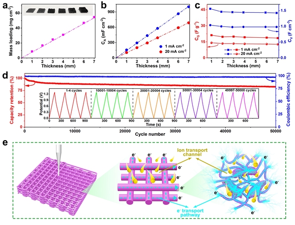 贗電容對(duì)于超級(jí)電容器能量密度的提升具有很大的前景。獲得高性能儲(chǔ)能的關(guān)鍵在于構(gòu)建具有很好相互連通的開孔結(jié)構(gòu)贗電容電極。然而,如何實(shí)現(xiàn)贗電容電極結(jié)構(gòu)的一致性規(guī)?;瘶?gòu)筑以及高活性材料負(fù)載下的快速離子/電子傳輸,仍然具有較大的挑戰(zhàn)。