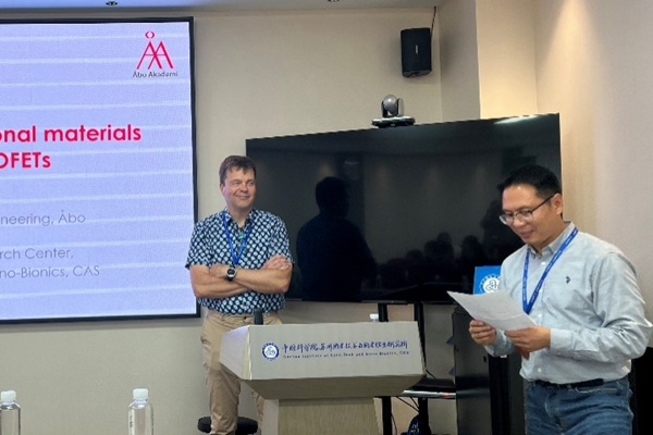 應(yīng)創(chuàng)新實驗室馬昌期研究員的邀請,芬蘭奧博學(xué)術(shù)大學(xué)Ronald sterbacka教授來所進行為期兩周的交流訪問。11月1日, sterbacka教授作了題為“Bioelectronics using functional materials and water-gated OFETs”的精彩學(xué)術(shù)報告。報告中,他詳細介紹了無標(biāo)記、超靈敏的“大型晶體管(SiMBiT)單分子檢測技術(shù)”,并通過該技術(shù)監(jiān)測胰腺囊腫以及時診斷胰腺癌。此外, sterbacka教授還講解了開發(fā)有機生物電子器件,可以利用電響應(yīng)通過激活患者自身心肌細胞的NOTCH信號以修復(fù)梗死的心肌組織。這些技術(shù)都表明便攜式生物電子平臺在疾病診斷和治療方面大有可為。