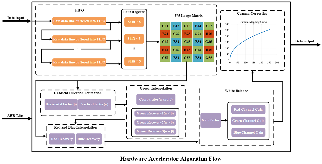 作品基于安路科技EG4S20板卡,采用Cortex-M0 DesignStart Eval搭建視頻處理SOC系統(tǒng)、設計ISP硬件加速器、掛載HDMI、SDRAM、SD-CARD等外設;將去馬賽克聯(lián)合去噪、白平衡、伽馬變換和色彩校正等算法部署到硬件電路中,實現(xiàn)BAYER-RGB空間的轉換,視頻恢復;支持自主開發(fā)的上位機軟件和按鍵的調試。